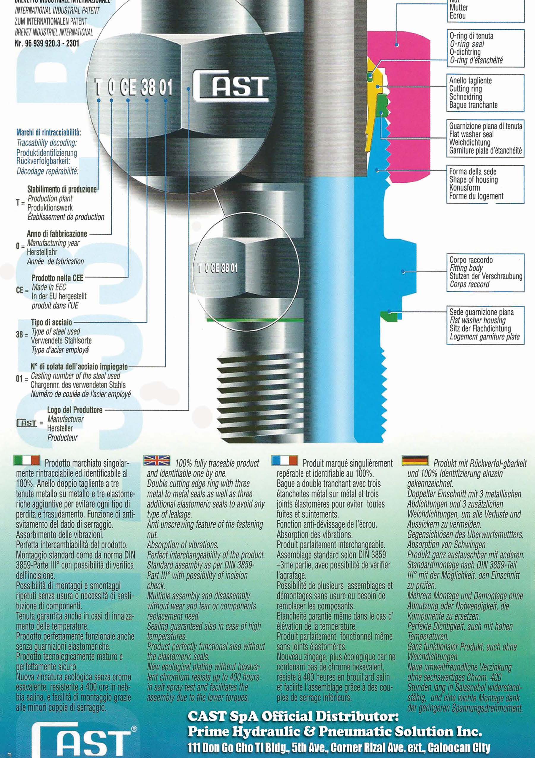 CAST S.p.A. is a company in continuous growth, among the most prestigious ones of the European hydraulic markets, watchful to technical innovations and ready to readjust to the newest market trends, working in close cooperation with its customers and suppliers. The Administrative and Accounting offices as well as the Distribution Center is in Volpiano. The high technical Know How, due to a constant application in Research and Development, has leaded CAST S.p.A. to great improvements to the standard products. Our production derives from strict international norms and a rigorous production make CAST fittings a winner product in all applications, especially where absolutely reliable material is requested. Both in Italy and abroad, wherever our product has been used, we have experienced a success that has let us enter the Vendor Lists of worldwide known O.E.M.s. The company motto "For a constant improvement" is pushing us to go further on and to be prepared for future challenges with new initiatives. The well established CAST reality offers a sale service, before and after the purchase, to fulfill its partners in the most comprehensive way. The constant sale and technical support is given by literature so to create a better understanding of the specific characteristics of our products, as well as training courses in our premises. CAST S.p.A. Commercial Office through detailed technical catalogues, flanked by the advise of our well prepared employees, allows straight and clear replies to all the queries under the constant supervision of the Quality Management System. The general technical catalogue explains all the technical choices operated by CAST giving, therefore, a preventive information as well as all the continuous upgrades both imperative for excellent external relations. In case of need CAST S.p.A. will send technical employees everywhere in the world.